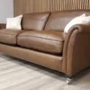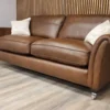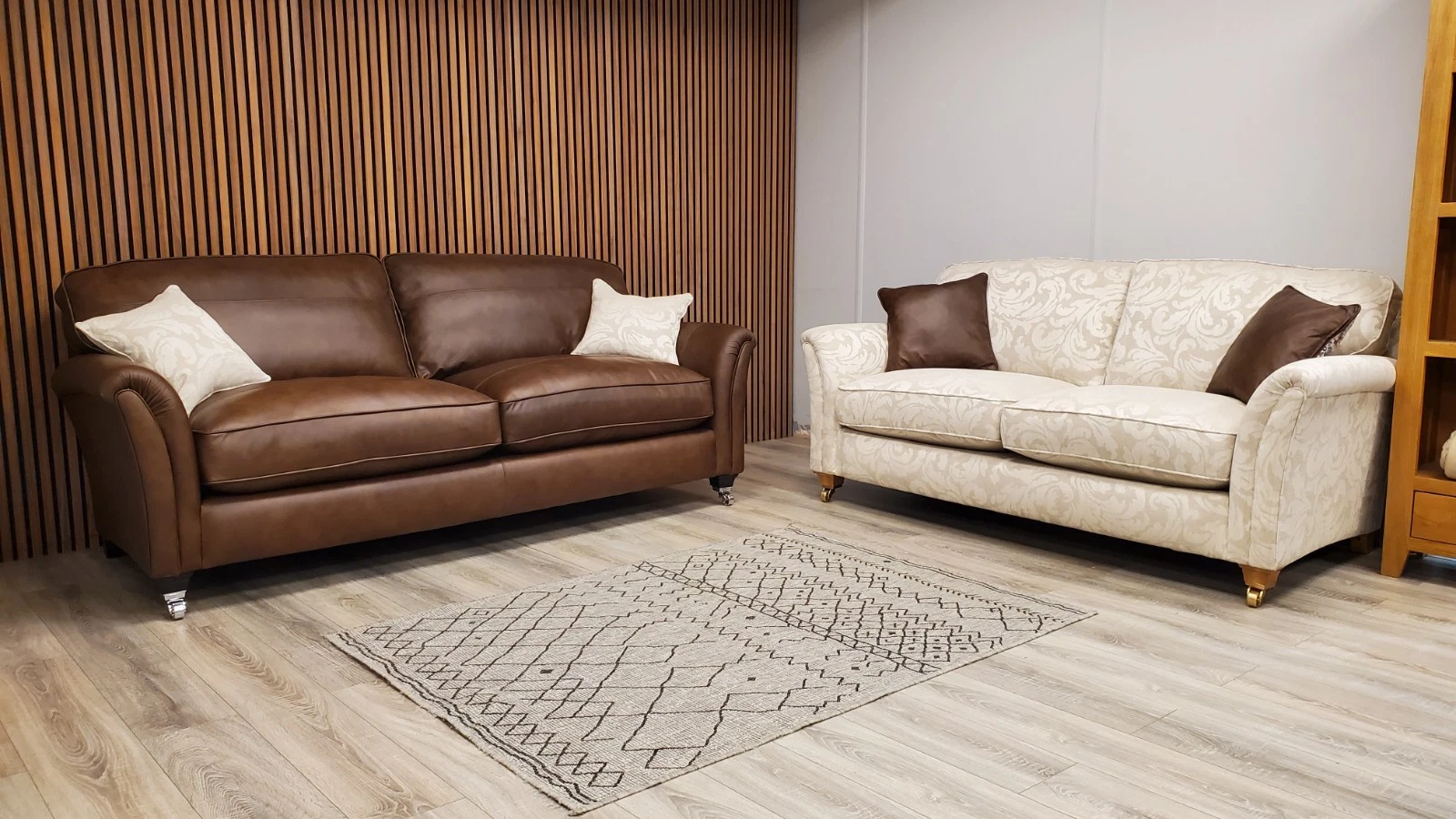 Parker Knoll Devonshire ‘Grand’ leather sofa with floral contrast fabric 3 seater sofa set! Constructed from hardwood materials this parker knoll Devonshire sofa is built to last! Classically designed With compact arms, deep-filled cushions & Finished in parker knolls ever popular ‘COMO CHOCOLATE’ full premium leather & one of parker knolls leading pattern designs. this Parker Knoll Devonshire sofa suits both the traditional and contemporary living room!